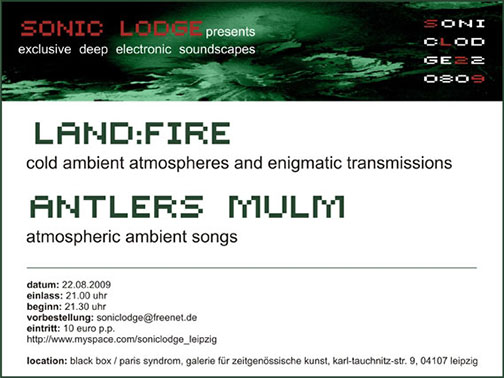 Antlers Mulm + Land:Fire, Leipzig, 22.08.2009 - Stigmata · 05/08/2009 Интересный концерт в Лейпциге. Поделиться: