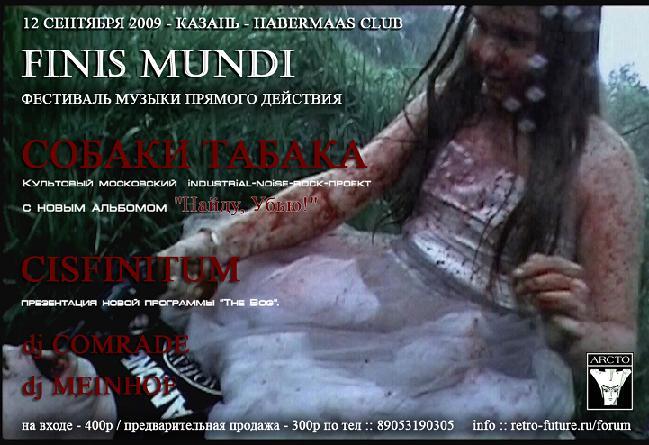 Итак хэдлайнерами фестиваля станут два московских проекта, которые на протяжении вот уже более чем десяти лет уверенно себя чувствуют в авангарде русской пост-индустриальной сцены — СОБАКИ ТАБАКА и CISFINITUM. Уникальность данного события отягощается ещё и тем фактом, что оба проекта выносят на суд слушателей абсолютно новые концертные программы — СОБАКИ ТАБАКА презентуют свой долгожданный альбом «Найду, Убью!», который ещё до своего выхода стал чуть ли не главным событием российской сцены независимой музыки, а CISFINITUM представит новую программу «The Bog», записанную при помощи звуков жаб на болотах в Китае (провинция Юннань) и Северном Кавказе (Волконское Ущелье), и также запланированную к публикации в скором времени.