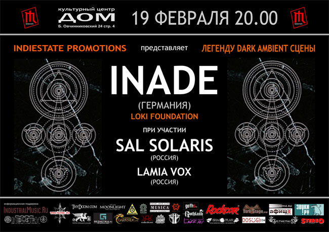 Indiestate Promotions приглашает любителей индустриальной музыки на свое очередное мероприятие. На этот раз нашими гостями станут известные каждому любителю dark ambient в России немецкие артисты из проекта Inade. Группа уже не раз выступала в России, в том числе на третьем фестивале Heilige Feuer в 2002 году, и по сути является одной из самых любимых и уважаемых в своем жанре среди российской публики. На этот раз артисты покажут программу, основанную на последнем, горячо принятом слушателями, альбоме “The Incarnation Of The Solar Architects”.