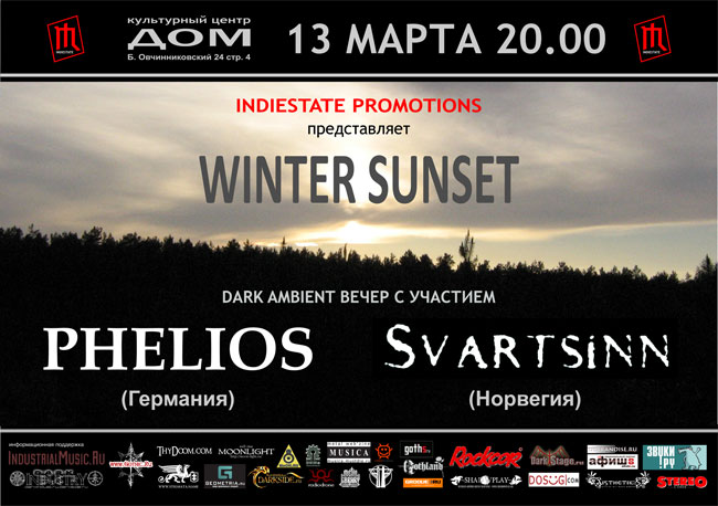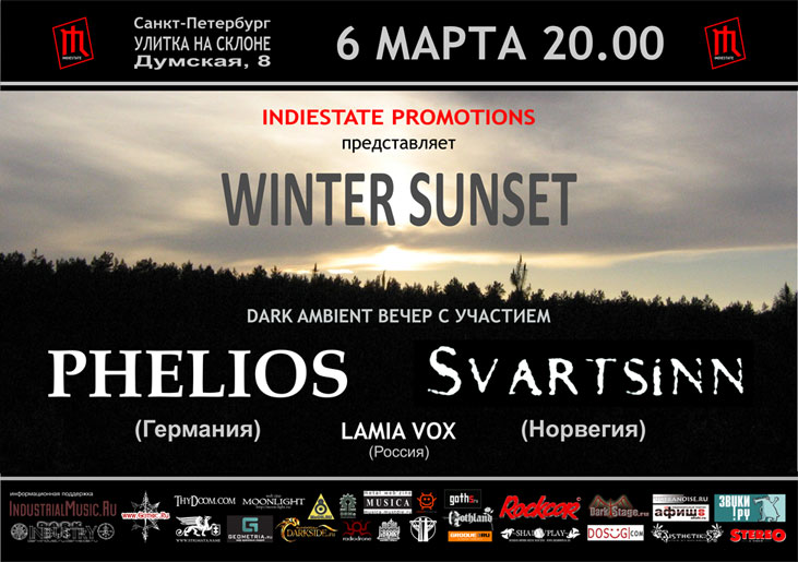 Indiestate Promotions приглашает любителей индустриальной музыки проводить эту бесконечно морозную и снежную зиму на вечер dark ambient музыки Winter Sunset. И хотя закат этого царства холода и льда вряд ли наступит в первой половине марта, когда на сцену выйдут наши гости, предчувствие весны уже затеплится в сердцах, озябших, но не остывших.
