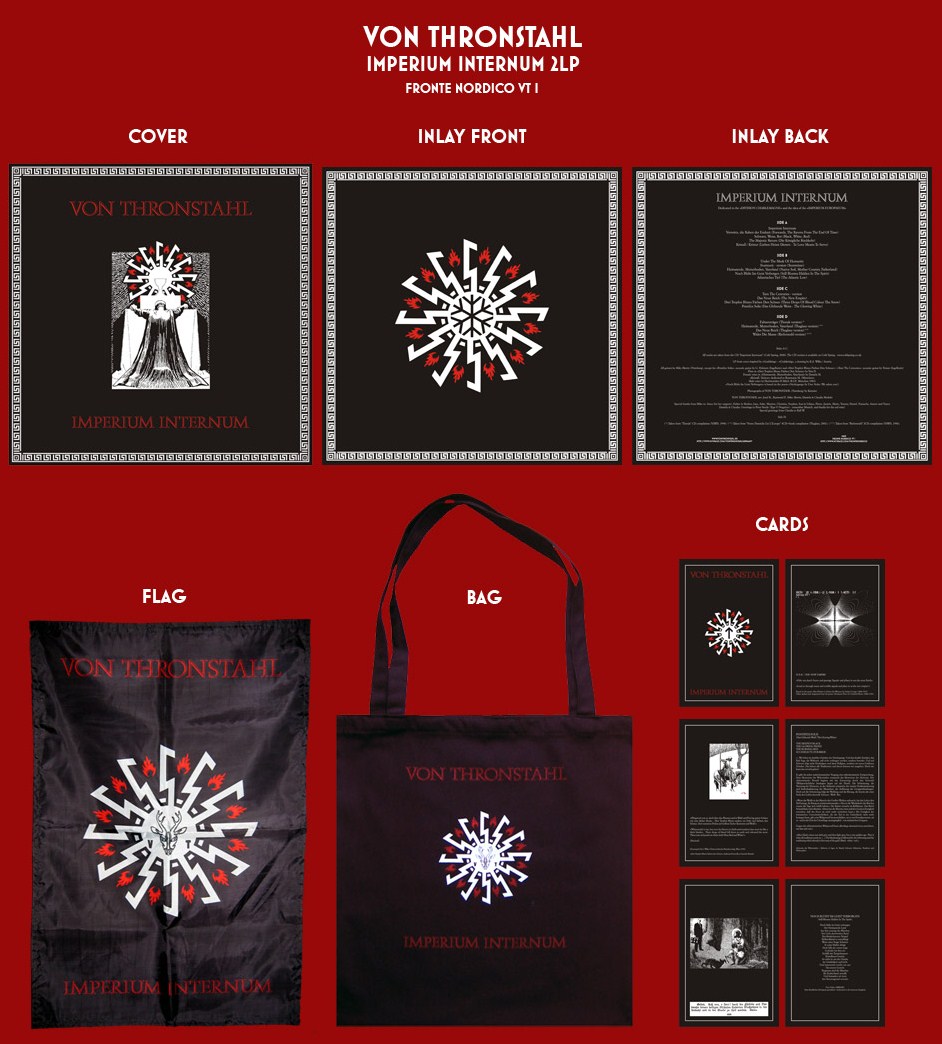 Молодой лейбл Fronte Nordico продолжает радовать любителей винила. После издания двойного SONNE HAGAL Only Echoes Remain какбэ эстонцы планируют переиздание на виниле классических альбомов VON THRONSTAHL. Первым будет переиздана работа немцев 2000 года Imperium Internum. Переиздание будет включать в себя как сам альбом, так и бонус-треки, выходившие на сборниках в тот же период времени — Riefenstahl (VAWS, 1996), Thorak (VAWS, 1998) и Notre Domicile Est L’Europe (Thaglasz, 2001). Винил будет издан в трех разных вариантах (50 шт. (сумка, флаг, папка, две пластинки белого цвета, вкладыш и 3 открытки), 100 шт. (папка, две пластинки красного цвета, вкладыш и 3 открытки), 150 шт. (папка, две пластинки черного цвета, вкладыш и 3 открытки).