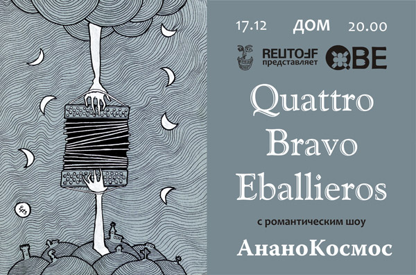 И, наконец, самое главное: будучи твердо уверенными в том, что «все в мире хуйня, не хуйня только то, что не в мире» участники Quattro Bravo Eballieros в совершенстве освоили искусство перемещения по эйдетическим осям – как вверх, так и вниз. А такие путешествия неизбежно заканчиваются встречей с тем, кого всуе лучше не поминать. С тем, кто, может быть, и умер, но уж точно не исчез. Следующая встреча с неописуемым состоится 17 декабря в культурном центре «ДОМ».