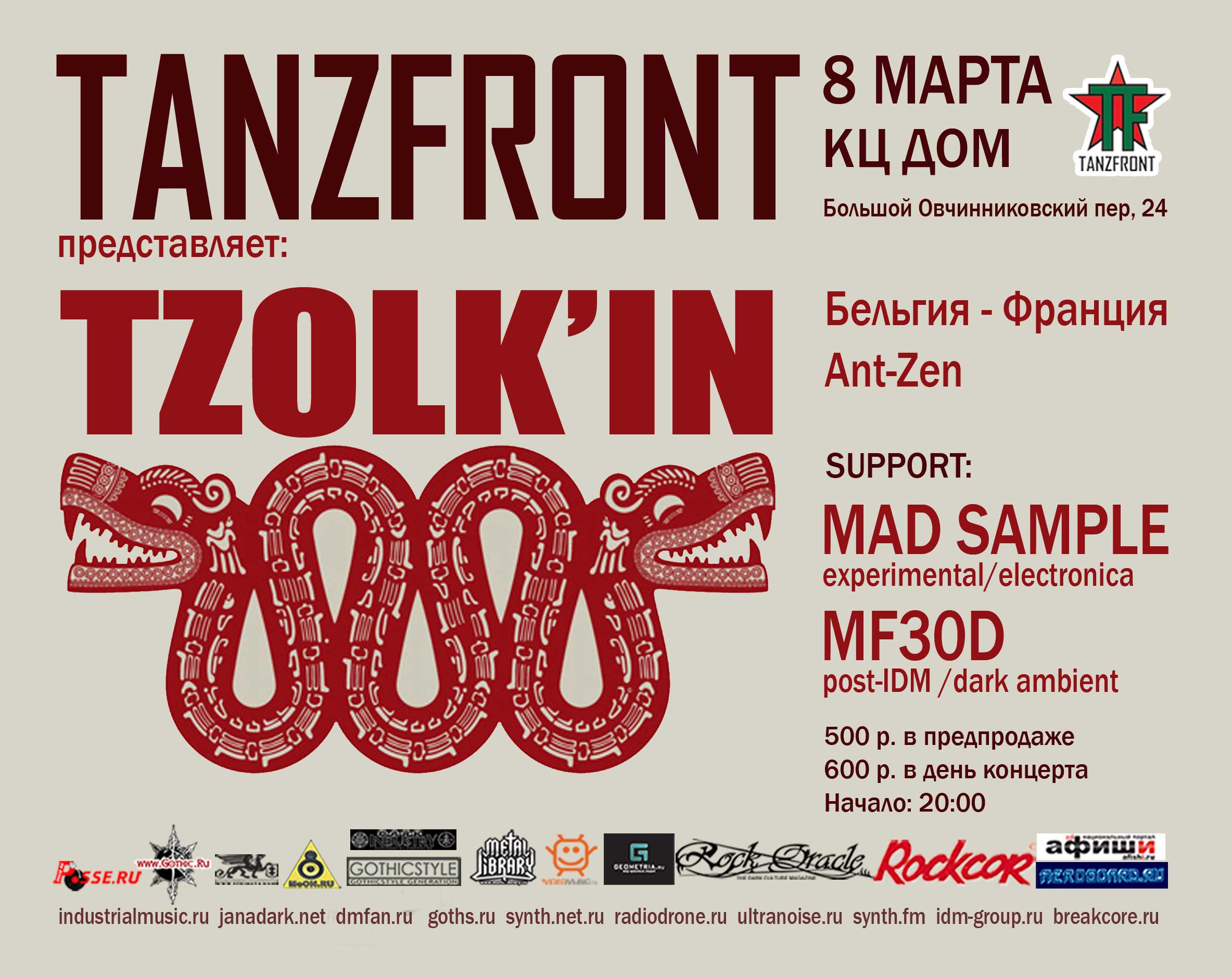 TANZFRONT вновь рад пригласить всех на очередную специальную акцию с участием проекта TZOLK’IN, приезд которого поклонники качественной электроники ждали годы. В праздничный день 8 марта музыканты готовят особый подарок для российской публики! Поддержку им окажут уже отлично зарекомендовавшие себя на московской сцене экспериментальные проекты Mad Sample и MF30D. Не пропустите это уникальное событие!