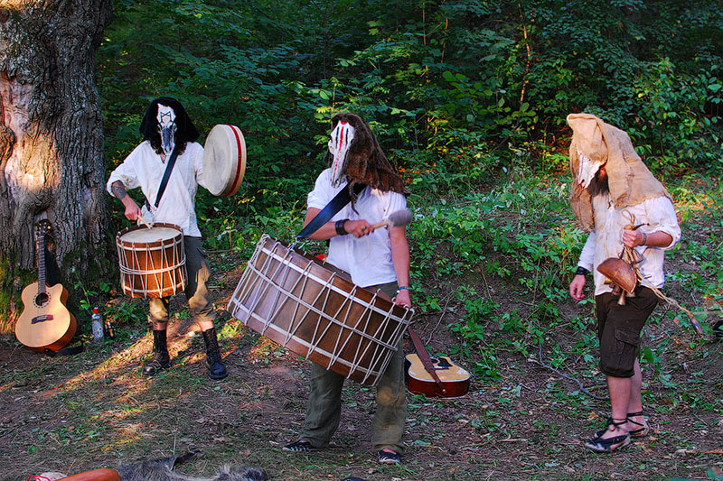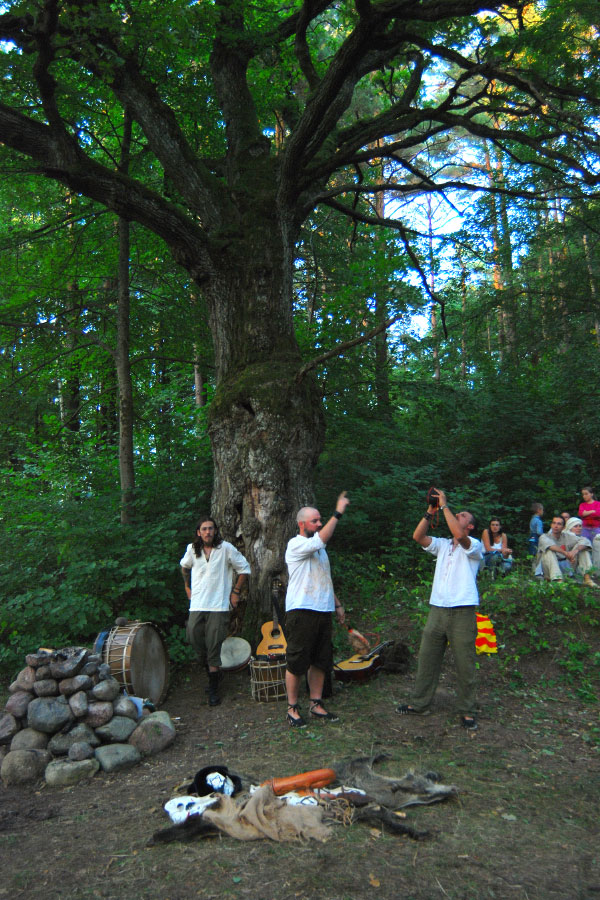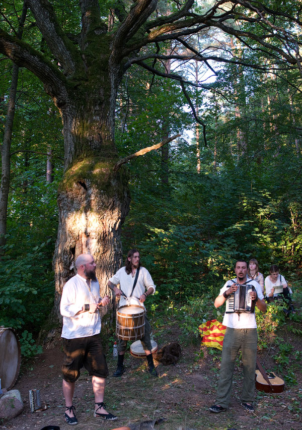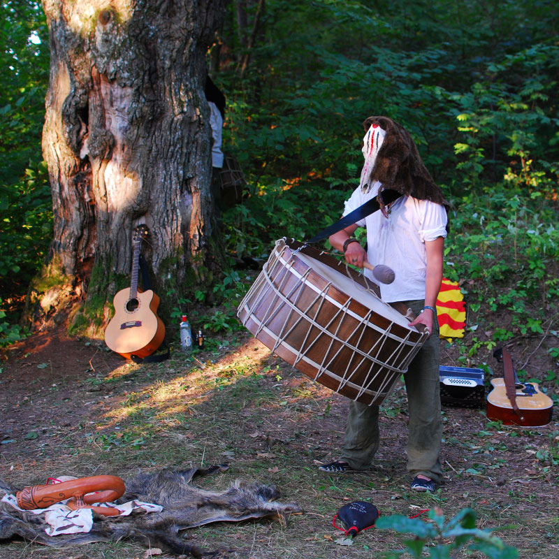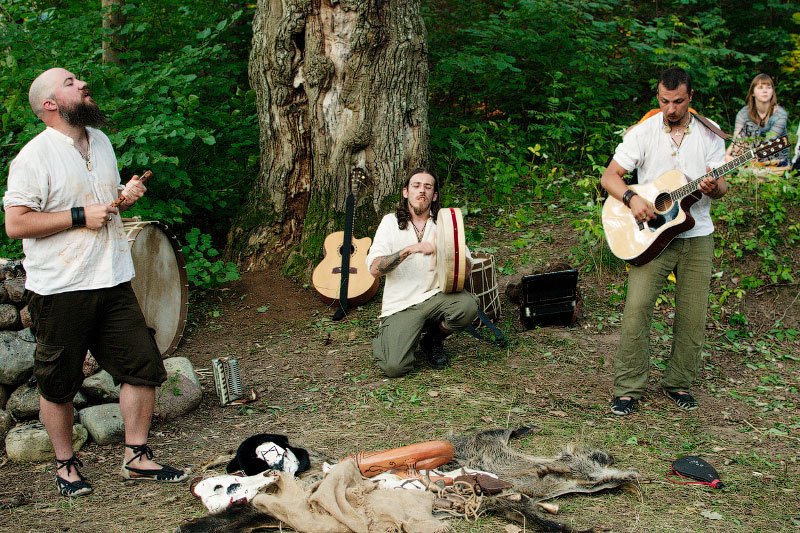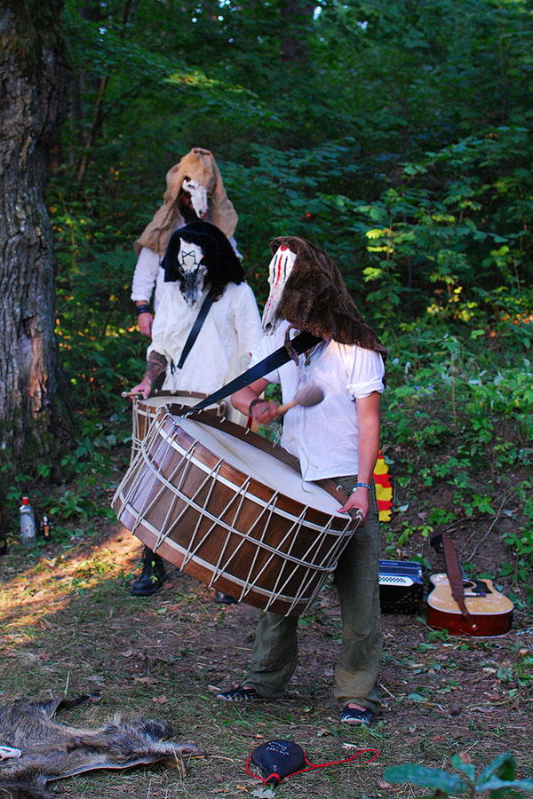 Выступление началось с того, что перед дубом появился человек, прятавший свое лицо под маской и шкурами, который начал бить в большой барабан. Постепенно к нему присоединились остальные члену группы, и начался ритуал.