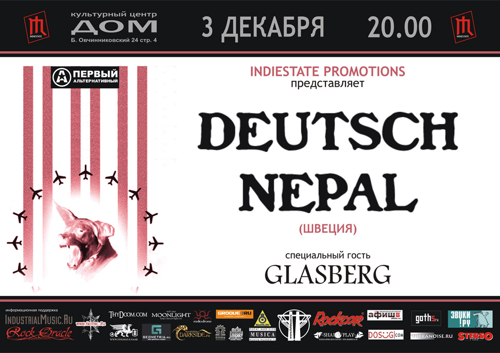 Indiestate Promotions рады представить очередной и для многих долгожданный российский тур одного из самых харизматических артистов сегодняшней индустриальной сцены – Лины Бэйби Долла и проекта DEUTSCH NEPAL. Центральной точкой нынешнего тура станет московское выступление проекта, которое по традиции пройдет в культурном центре “Дом”. Специальным гостем на нашем концерте, где Лина исполнит в основном композиции с нового и лучшего в его творческой карьере альбома Amygdala, станет санкт-петербуржский артист Glasberg, уже выступавший ранее на одной сцене с DEUTSCH NEPAL – его экспериментальный абсурдистский нойз с изящными отсылками к Хармсу и Беккету даст представление об индустриальном взгляде на мир с другого берега Балтики.