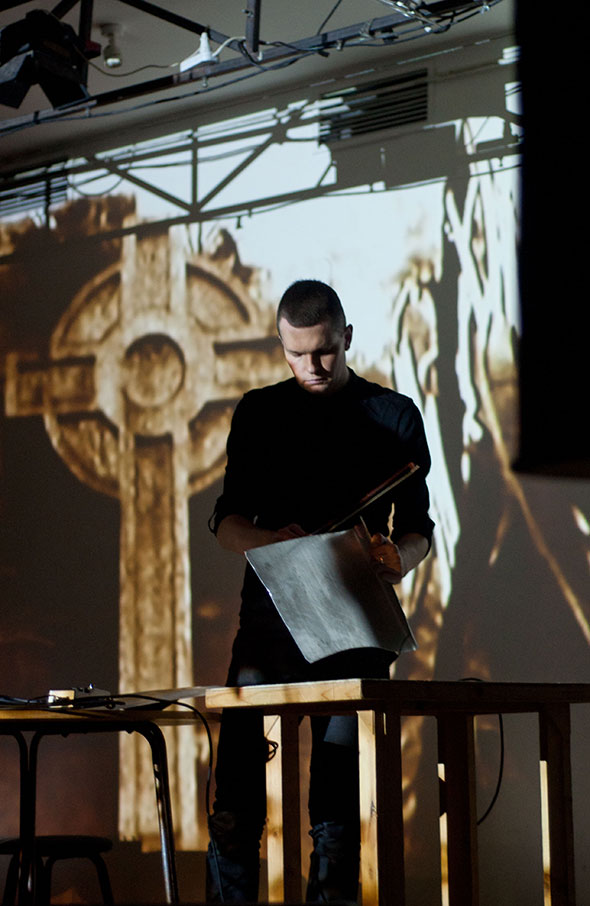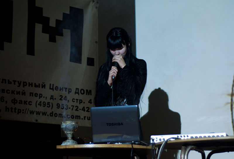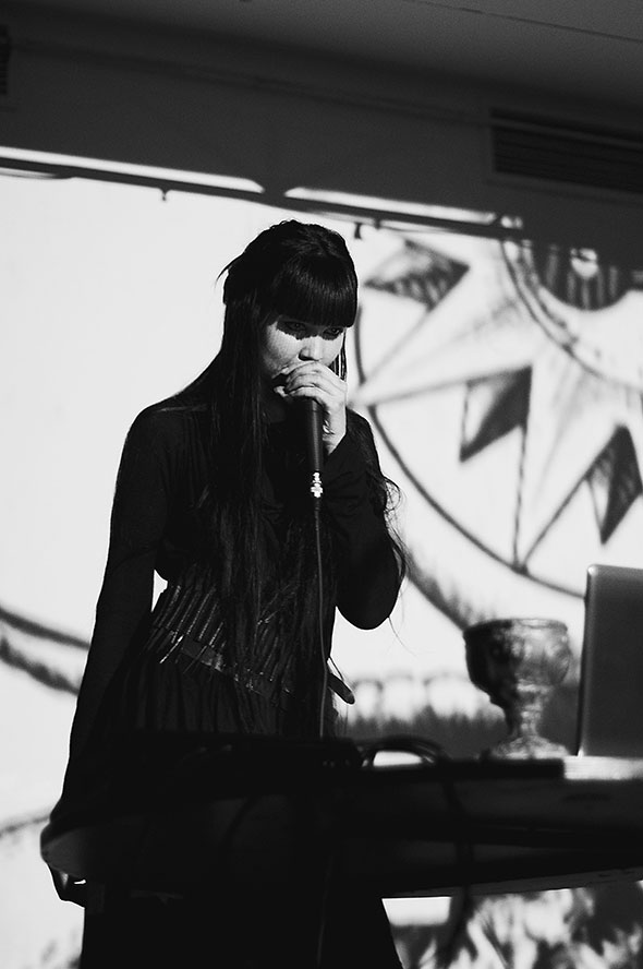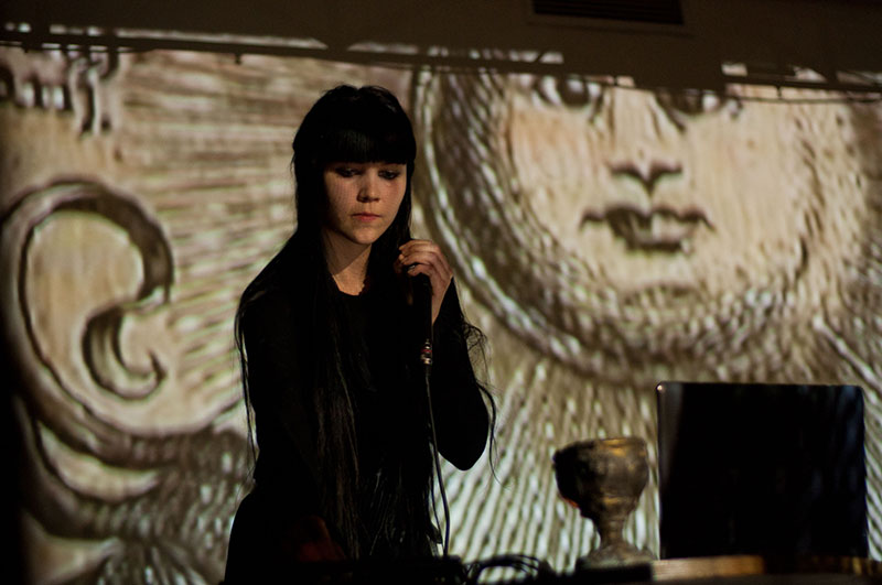 Первой на сцену вышла LAMIA VOX. Моё знакомство с музыкой этого проекта произошло на фестивале «Harfang» — тогда она привела меня в полный восторг, напрочь разрушив в моей голове стереотип, что dark ambient на концерте — это обычно дядька с ноутбуком в сопровождении видеоряда.  Вместе с LAMIA VOX на сцене появилась также новая деталь — кубок с дымящимся ладаном, и я поняла, что в этот раз оккультизма в её выступлении будет ещё больше. Так оно и оказалось: как только из колонок раздались первые звуки за временем я следить перестала и полностью погрузилась в мрачную атмосферу, наполненную зловещим шёпотом, запахом ладана, магическими символами и картинами словно предвещающими грядущий апокалипсис. Отыграв около часа Lamia уступила место на сцене Питеру Андерсену (RAISON D`ETRE). Признаться последний альбом RAISON D`ETRE прошёл как-то мимо меня, но некоторые печалятся, что в рамках этого проекта мистер Андерсон уже не тот. Судя по тому, что услышала я, могу сказать, что он просто идёт дальше, и выглядит и слушается всё это не хуже и не лучше, просто по другому. Музыка, в отличие от LAMIA VOX, стала более личной, более отрешённой, а видеоряд  предлагал нам попутешествовать по индустриальным развалинам, костнице, побродить среди каменных крестов…  Сам мистер Андерсон выглядел очень мрачным и сосредоточенным, казалось, что ему совсем нет дела до зрителей, и он в пребывает в каком-то своём мире, где прихлёбывая из бутылки алкоголь, экспериментирует со звуковыми полотнами используя для  разбавления звука казалось не сочетаемые между собой предметы, например лист железа, который Питер терзал при помощи смычка и кисточки с металлическим ворсом. Выступление RAISON D`ETRE так же продлилось примерно час, после чего несмотря на непрекращающиеся аплодисменты, мистер Андерсон сказал, что это была последняя композиция и быстро удалился со сцены. Итог же подведу словами моего друга, который впервые попал на подобное мероприятие, «круто, но под конец стало немного скучно».