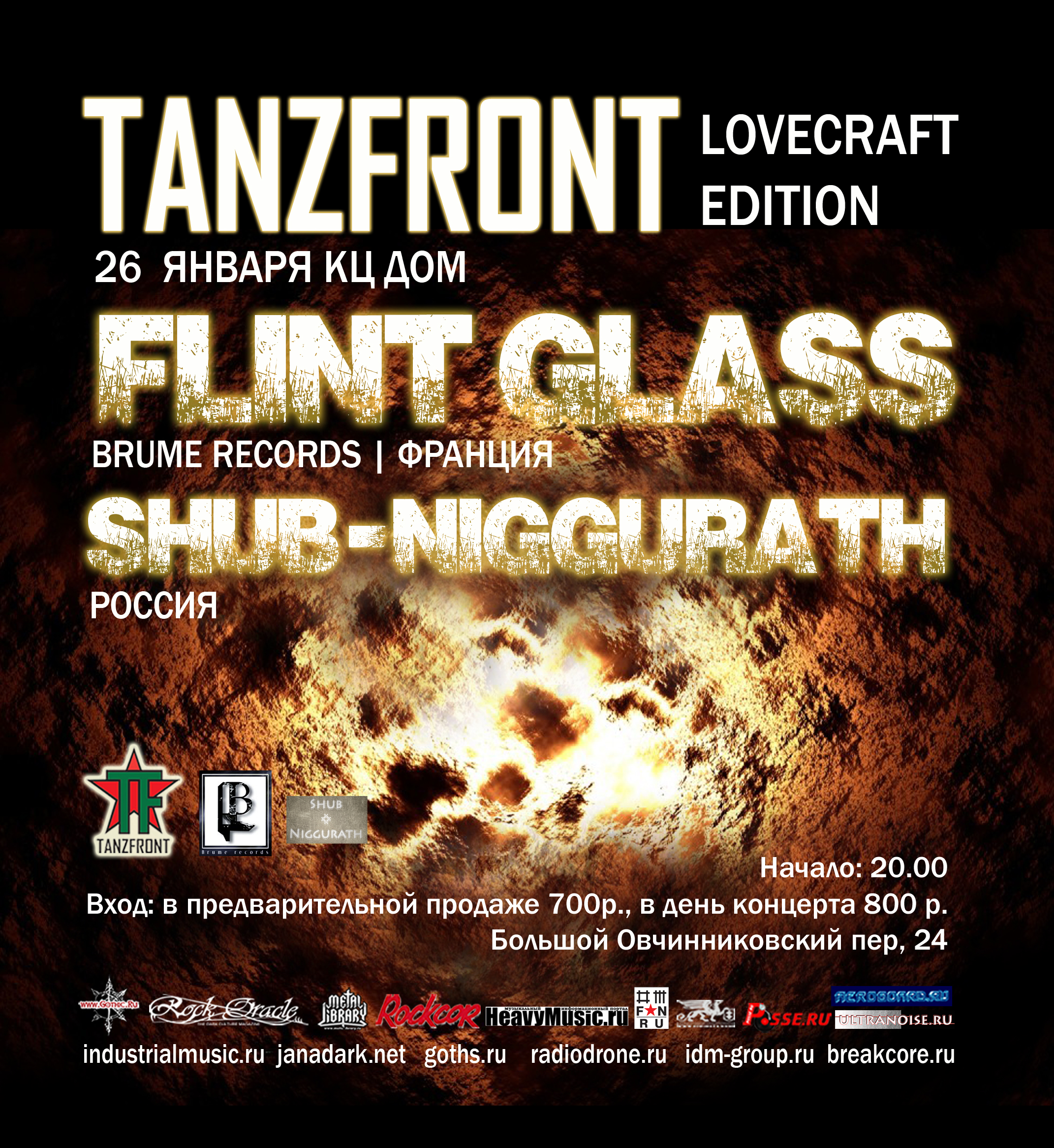 TanzFronT ProjecT рад представить всем поклонникам мрачной электроники свой первый после некоторого перерыва концерт, который откроет сезон 2013 года. На этот раз нашим гостем станет давно известный и полюбившийся большинству московских слушателей проект из Франции Flint Glass, неоднократно с успехом выступавший у нас ранее. В качестве поддержки выступит молодой, но талантливый и многообещающий проект Shub-Niggurath из Москвы. Будучи довольно различны по жанру, оба проекта близки по духу, оба увлечены лавкрафтианской криптомифологией, оба исследуют пространства по ту сторону сна, изучают сакральную географию хребтов безумия и стараются проникнуть глубоко в жизнь очень старого народа. Поскольку январская мгла – самое время соприкоснуться с тайной, древнее которой нет, и услышать отголоски зова Ктулху, отраженные в музыке наших гостей, мы решили назвать наше мероприятие TanzFronT Lovecraft Edition. Ждём всех неравнодушных к самым потаённым уголкам темной стороны бытия 26 января в КЦ «Дом».
