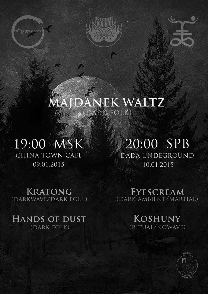 Sulphur Flowers, Mist-Crossing Division и Kali Yuga Promo представляют: 9 января в московском China-Town-Cafe и 10 января в Dada Underground в Санкт-Петербурге выступит московско-рязанский проект MAJDANEK WALTZ при поддержке ряда дарк-фолковых и пост-индустриальных проектов.