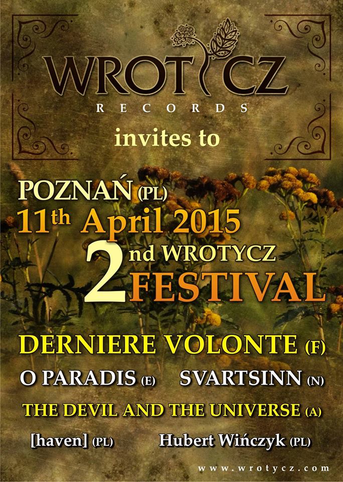 Продолжаем тему отличных фестивалей, посетить которые собирается наша дорогая редакция. Итак, Польша, город-герой Познань, 11 апреля. Вторая редакция праздника от лейбла Wrotycz. Состав артистов очень и очень — THE DEVIL & THE UNIVERSE, DERNIERE VOLONTE, O PARADIS, SVARTSINN.