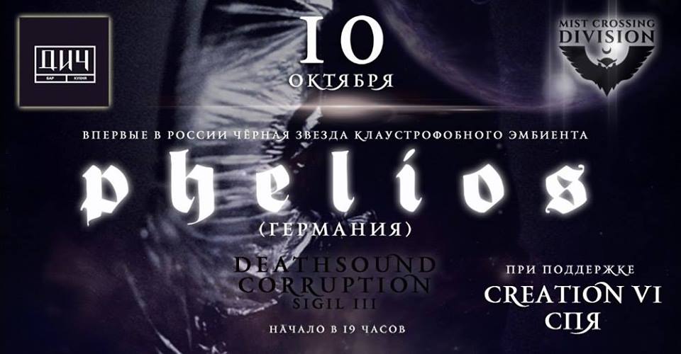 Живая икона dark ambient и, без преувеличения, эталон стиля. Впитав лучшие практики, Мартин Штурцер, создает более 13 лет уникальное и вязкое звучание, которое не оставляет равнодушными ни критиков, ни простых слушателей. Неимоверно консистентная, плотная и профессиональная звуковая обвязка Phelios — нечто уникальное и всеобъемлющее. Резидент легендарных Eternal Soul Records с первым концертов в России. Истинный центр стиля, отвечающий на корневой вопрос — «Что же такое dark ambient?»Creation VI