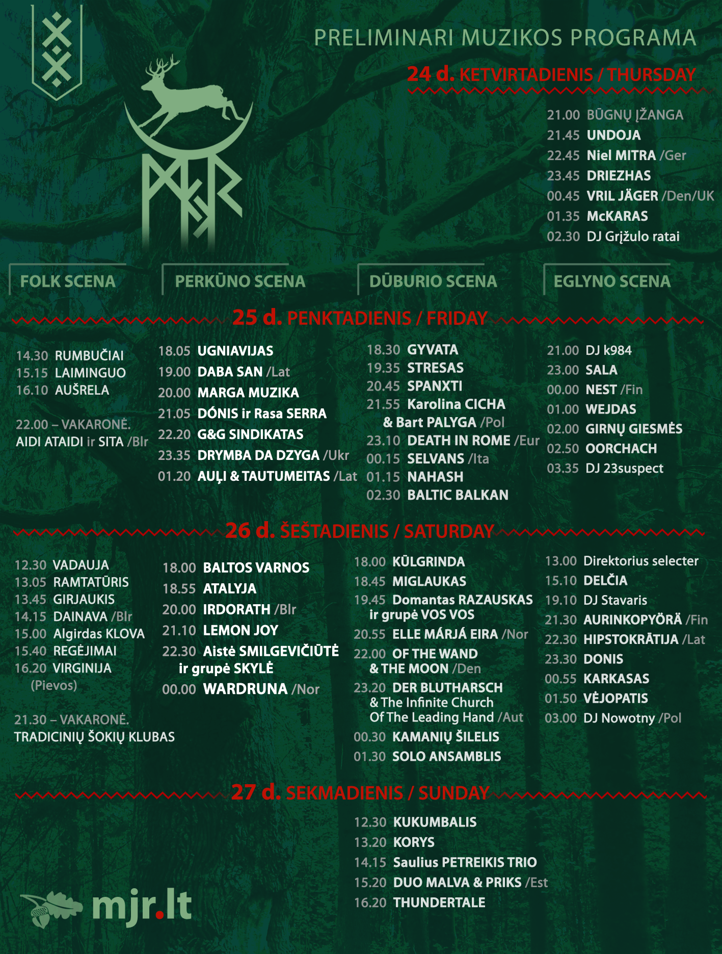 в 6 вечера выступают UGNIAVIJAS и GYVATA, в 9 — DONIS и Rasa SERRA, в 11 — DEATH IN ROME, полночь — NEST, в час ночи — WEJDAS;