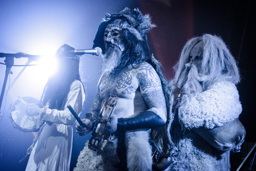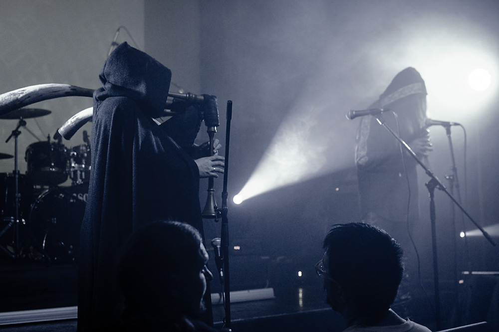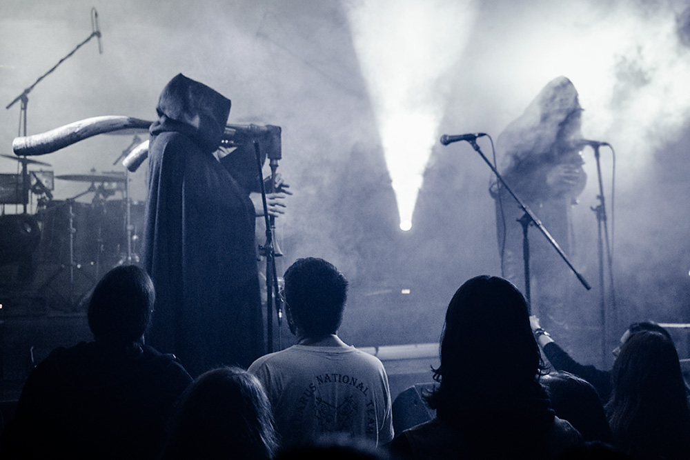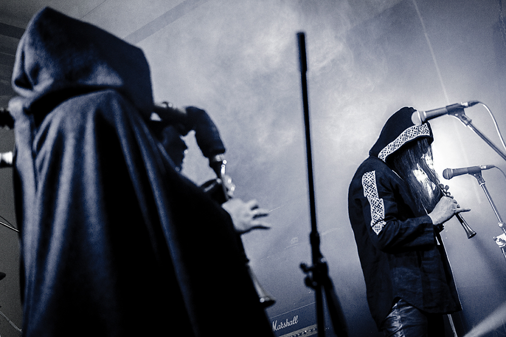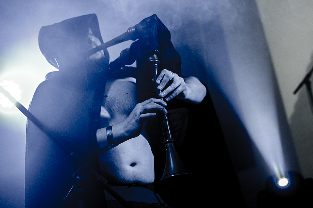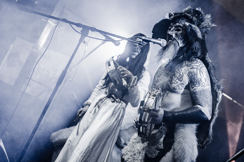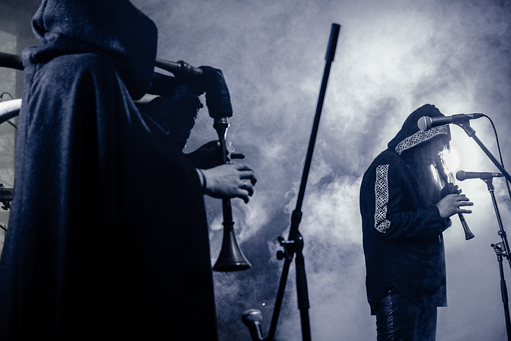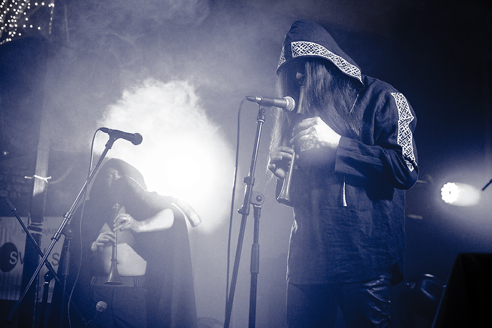 Как я уже сказал ранее, Войст в Менск прибыл с пневмонией, что есть подвиг, но уж больно ему хотелось представить публике новые звук и имидж группы. На этот раз PRAGNAVIT был действительно группой — пять человек на сцене! Вокалистка! Все в костюмах и масках. Можно сказать, что перед нами была супер-группа, потому что с Войстом разделили сцену Микус (КРЫВАКРЫЖ) и музыкант из Украины, игравший ранее с известной black metal группой KRODA. Новое звучание PRAGNAVIT – это все тот же ритуальный ambient, но более трансовый, психоделический и шаманский. Музыка группы стала проще, но забористее. Хотелось бы пояснить про «проще». Творчество одних артистов со временем становится сложнее — это понятно: больше знаний, больше мастерства, хочется наворотить побольше. Хороший пример — норвежские black metal группы, первые альбомы которых представляли собой крайне примитивную, сырую, злую музыку, мало отличающуюся от крайне примитивных архаичных ритуалов. Про близость black metal и архаичной ритуальной музыки хорошо написано у Кадмона в Аорте. Просто послушайте, например, первые релизы GORGOROTH, а потом посмотрите ролики с фестиваля барабанщиков в деревушке Calanda, являющегося отголоском древних языческих мистерий. Но прошли годы, и сегодня мало кто из тех норвежцев, кто записывал сырой яростный black, продолжает это делать. Большинство старых норвежских команд в наши дни играет довольно сложную музыку — техничный метал, арт-рок, джаз и т. д.