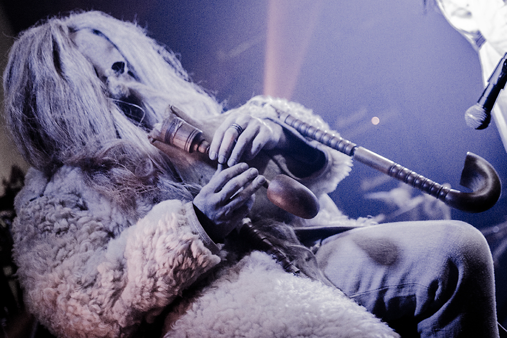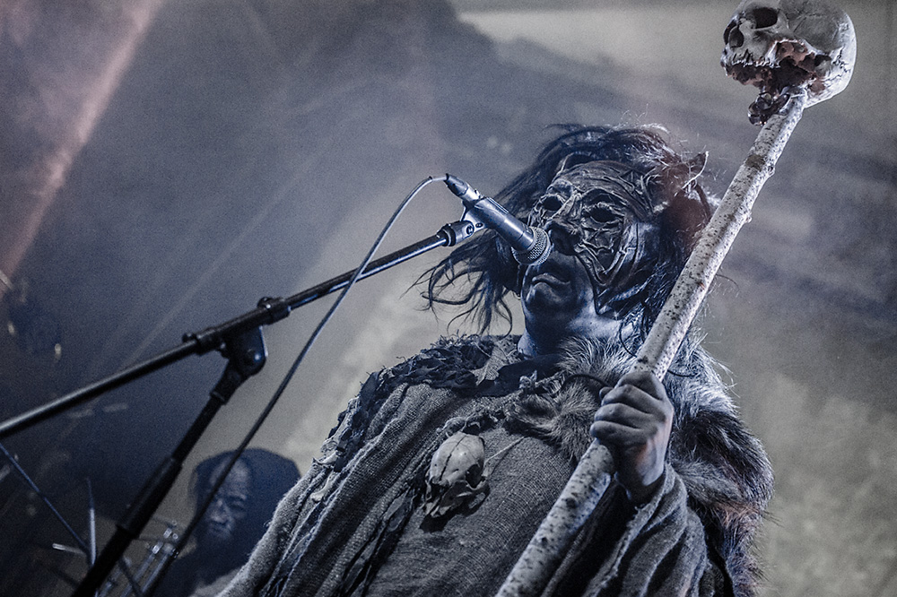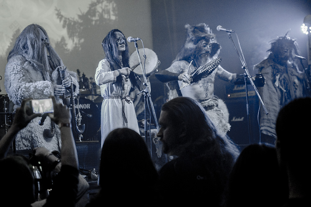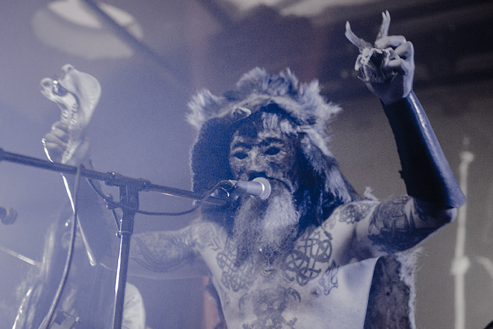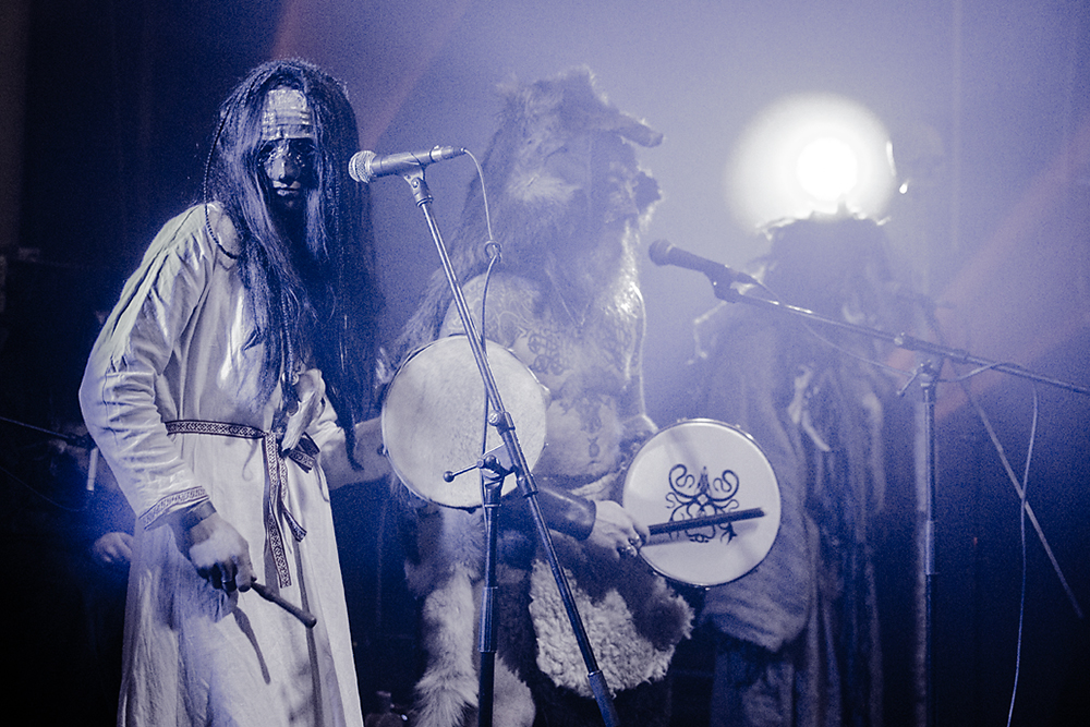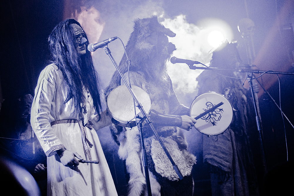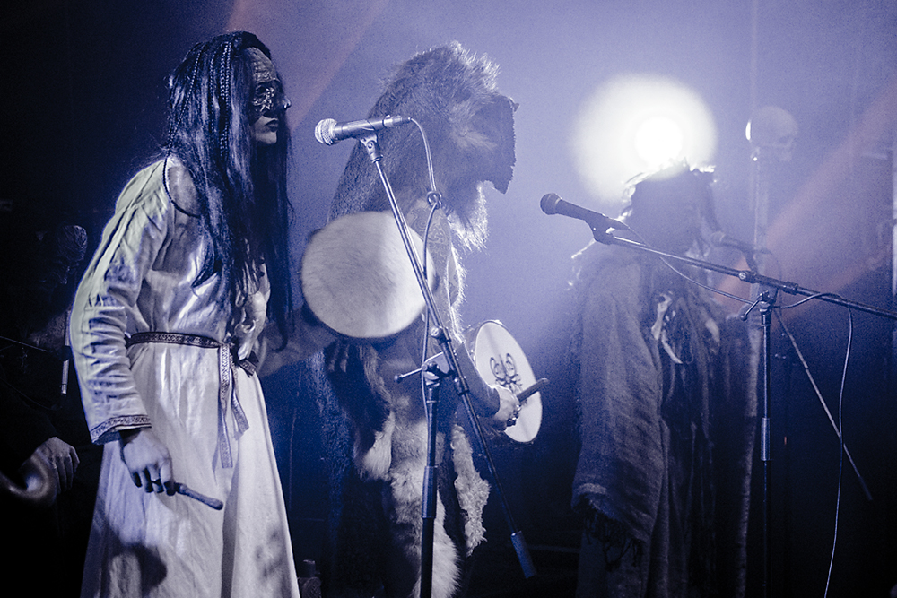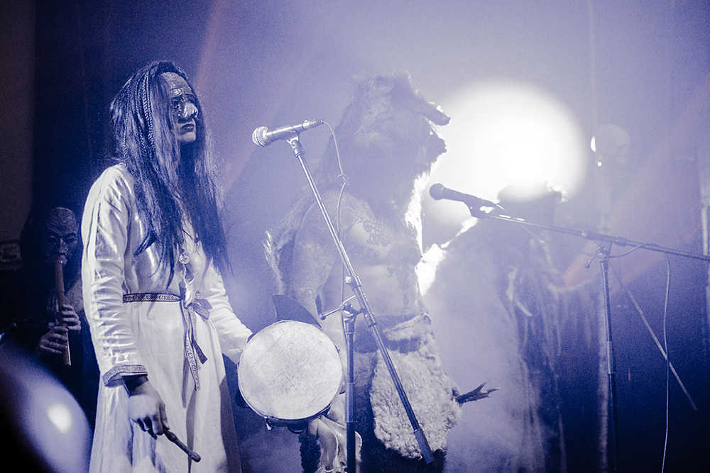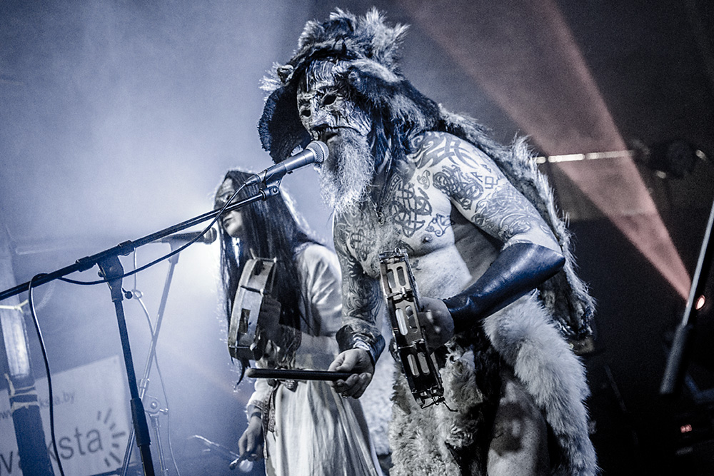 Как я уже сказал ранее, Войст в Менск прибыл с пневмонией, что есть подвиг, но уж больно ему хотелось представить публике новые звук и имидж группы. На этот раз PRAGNAVIT был действительно группой — пять человек на сцене! Вокалистка! Все в костюмах и масках. Можно сказать, что перед нами была супер-группа, потому что с Войстом разделили сцену Микус (КРЫВАКРЫЖ) и музыкант из Украины, игравший ранее с известной black metal группой KRODA. Новое звучание PRAGNAVIT – это все тот же ритуальный ambient, но более трансовый, психоделический и шаманский. Музыка группы стала проще, но забористее. Хотелось бы пояснить про «проще». Творчество одних артистов со временем становится сложнее — это понятно: больше знаний, больше мастерства, хочется наворотить побольше. Хороший пример — норвежские black metal группы, первые альбомы которых представляли собой крайне примитивную, сырую, злую музыку, мало отличающуюся от крайне примитивных архаичных ритуалов. Про близость black metal и архаичной ритуальной музыки хорошо написано у Кадмона в Аорте. Просто послушайте, например, первые релизы GORGOROTH, а потом посмотрите ролики с фестиваля барабанщиков в деревушке Calanda, являющегося отголоском древних языческих мистерий. Но прошли годы, и сегодня мало кто из тех норвежцев, кто записывал сырой яростный black, продолжает это делать. Большинство старых норвежских команд в наши дни играет довольно сложную музыку — техничный метал, арт-рок, джаз и т. д.