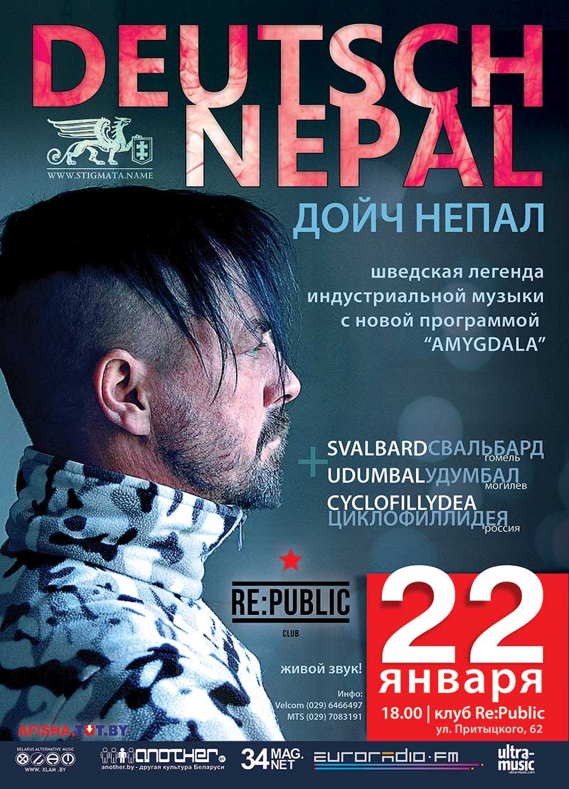22 января в клубе RE:PUBLIC состоится выступление легендарного шведского музыканта Питера Андерссона (aka Лина Бэби Долл) и его культового проекта DEUTSCH NEPAL, одного из самых ярких явлений современной европейской индустриальной сцены и патриарха культового лейбла Cold Meat Industry. Лина Бэби Долл представит беларусам свой новый (и лучший на данный момент!) альбом Amygdala, открывая январским концертом в Минске европейский тур, приуроченный к 20-летию творческой карьеры DEUTSCH NEPAL. Вместе с Линой Бэби Долл на сцену поднимутся: старейший беларусский dark ambient проект UDUMBAL (альтер эго PRAGNAVIT), петербуржцы CYCLOFILLYDEA, а также гомельский military-pop коллектив SVALBARD, который представит минчанам свой второй полноформатный альбом, вышедший в Германии на лейбле Lichterklang.